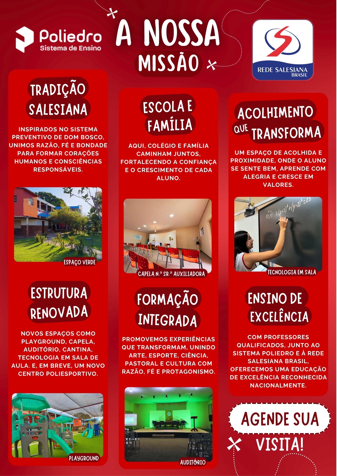 Acreditando que a educação, escolar e espiritual, é o caminho para um mundo melhor, o Colégio Salesiano Santa Maria oferece infraestrutura completa e equipes preparadas para garantir excelência em todas as etapas do aprendizado. Faz parte de uma rede que está presente em mais de 130 países e que possui um método educacional – baseado no tripé Razão, Religião e Carinho – reconhecido em todo o mundo.